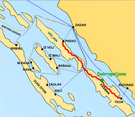 Do nas možete doći na nekoliko načina. Prvi način je avionom do aerodroma Zadar, a drugi način brodom iz Ancone za Zadar. Iz Zadra trajektom do Preka na otoku Ugljanu pa autobusom do Dobropoljane. Također možete iz Zadra autobusom do Biograda n/m gdje se opet ukrcavate na trajekt za Tkon na otoku Pašmanu pa autobusom do Dobropoljane. Treći način je direktno automobilom pa na jedan ili drugi trajekt, a red plovidbe i cijenu karte možete saznati klikom na link www.jadrolinija.hr |
